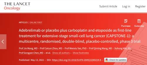 北京时间2022年5月14日,j9国际站自主研发的PD-L1抑制剂阿得贝利单抗治疗广泛期小细胞肺癌的III期临床研究(CAPSTONE-1研究)成果正式全文在线发表于国际权威学术期刊《柳叶刀·肿瘤学》(《THE LANCET Oncology》,影响因子41.316)。CAPSTONE-1研究结果显示,阿得贝利单抗联合化疗一线治疗广泛期小细胞肺癌相较于安慰剂联合化疗可以显著延长患者总生存期至15.3个月[1],刷新现有免疫药物一线治疗广泛期小细胞肺癌的总生存纪录[2]