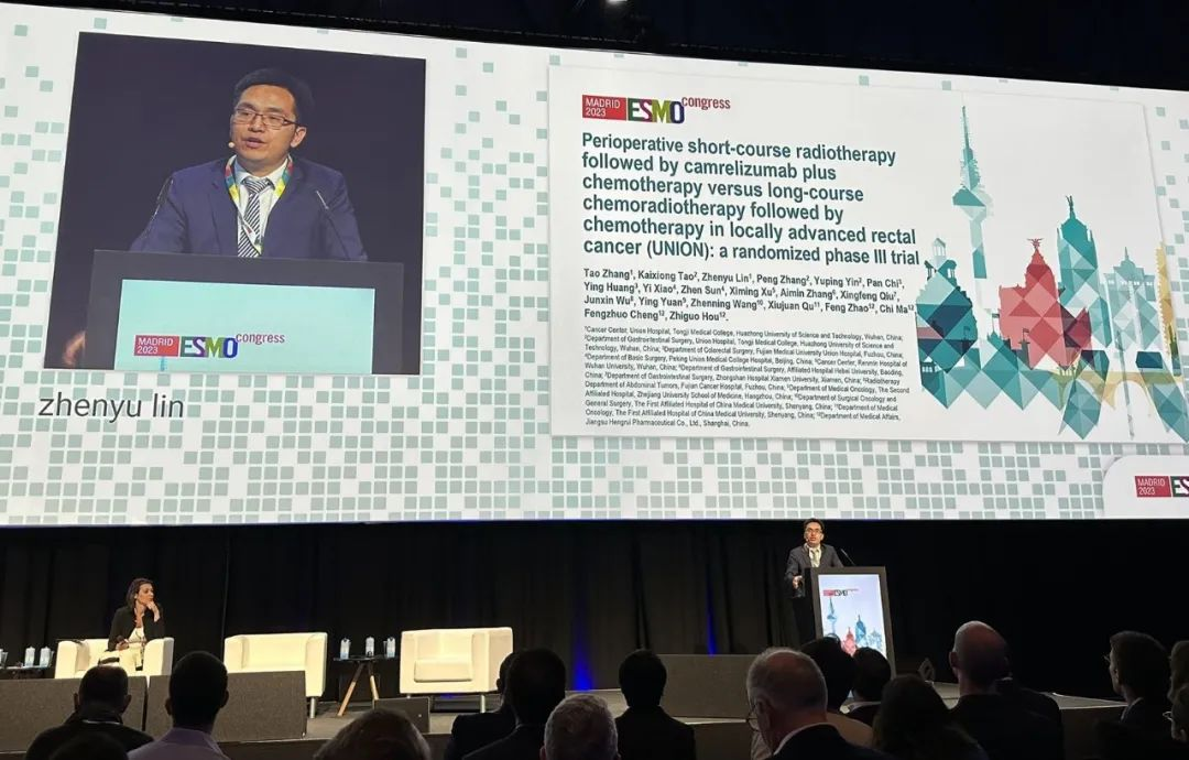 10月21日,j9国际站创新药卡瑞利珠单抗的一项研究“新辅助短程放疗序贯卡瑞利珠单抗联合化疗对比长程放化疗序贯化疗治疗局部晚期直肠癌”随机对照Ⅲ期试验(UNION)亮相2023 ESMO大会优选口头报告现场。该研究由华中科技大学同济医学院附属协和医院张涛教授、陶凯雄教授担任主要研究者,华中科技大学同济医学院附属协和医院林振宇教授在大会现场报告了该重磅研究的结果1。此项研究是全球首个评估短程放疗序贯免疫治疗联合化疗治疗局部晚期直肠癌的Ⅲ期研究,已达到主要终点病理完全缓解(pCR),有望为直肠癌患者的治疗提供新策略。