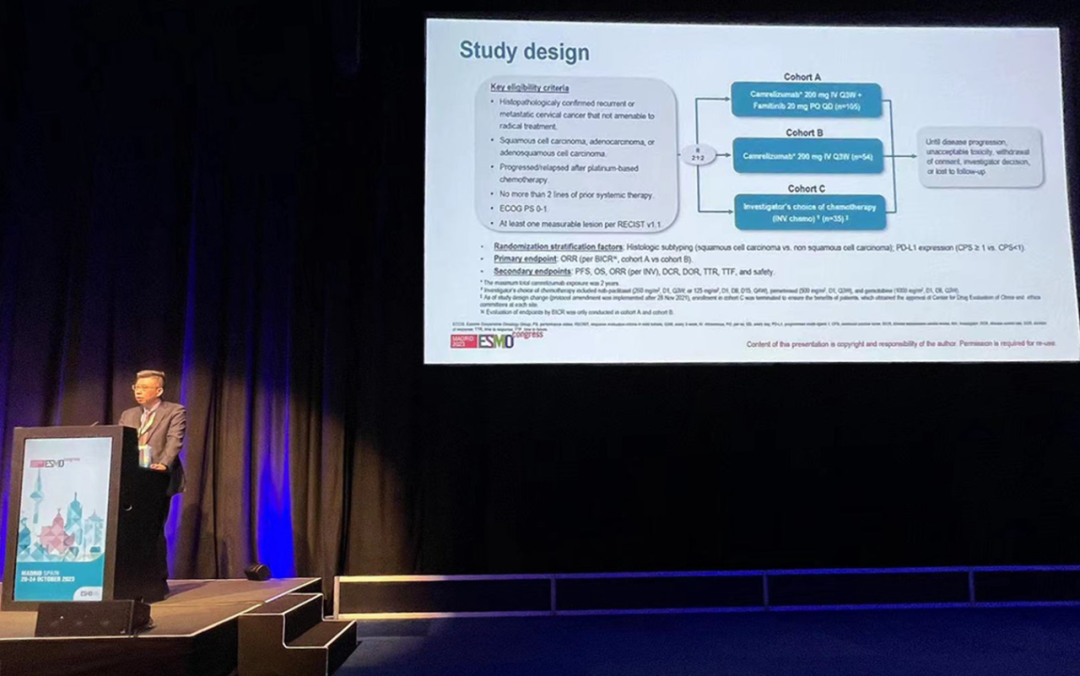 有望为宫颈癌患者带来治疗新选择10月22日,j9国际站创新药卡瑞利珠单抗联合法米替尼对比卡瑞利珠单抗单药或研究者选择的化疗治疗复发转移性宫颈癌随机、开放、对照、多中心的Ⅱ期临床研究(SHR-1210-Ⅱ-217) 亮相2023 ESMO大会简短口头报告现场3。该研究由复旦大学附属肿瘤医院吴小华教授团队开展,吴小华教授在现场公布了该重磅研究进展。研究结果显示,在既往以铂为基础化疗失败后复发或转移性宫颈癌患者中,与单独使用卡瑞利珠单抗或研究者选择的化疗相比,卡瑞利珠单抗联合法米替尼显著提高了抗肿瘤活性,安全性可控,有望为晚期宫颈癌患者提供新的治疗选择。