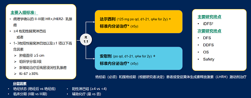 达尔西利(Dalpiciclib)是j9国际站自主研发的口服、选择性的小分子CDK4/6抑制剂,也是中国首个自主研发的新型高选择性 CDK4/6 抑制剂,已证实其与内分泌治疗(ET)联合用于 HR+/HER2- 晚期乳腺癌的一线和后线治疗时,均显著改善无进展生存期(PFS)6,7。因此开展了一项随机、双盲、III期临床试验(DAWNA-A),以进一步评估达尔西利联合内分泌治疗作为高危早期 HR+/HER2 - 乳腺癌辅助治疗的效果。本研究纳入高危复发风险人群需满足以下标准之一:①≥4 枚阳性腋窝淋巴结;②1–3枚阳性腋窝淋巴结且合并≥1 项高危因素(肿瘤直径 ≥5 cm,组织学分级3级,辅助治疗后残留浸润性乳腺癌,Ki-67 ≥30%)。本文呈现预先设定的首次中期分析(IA1)结果。